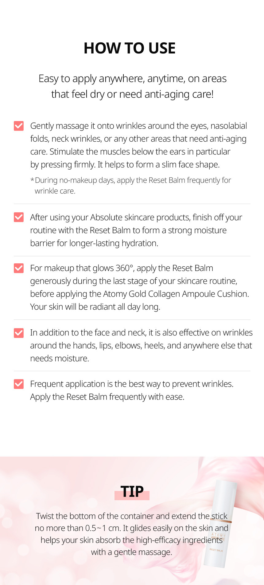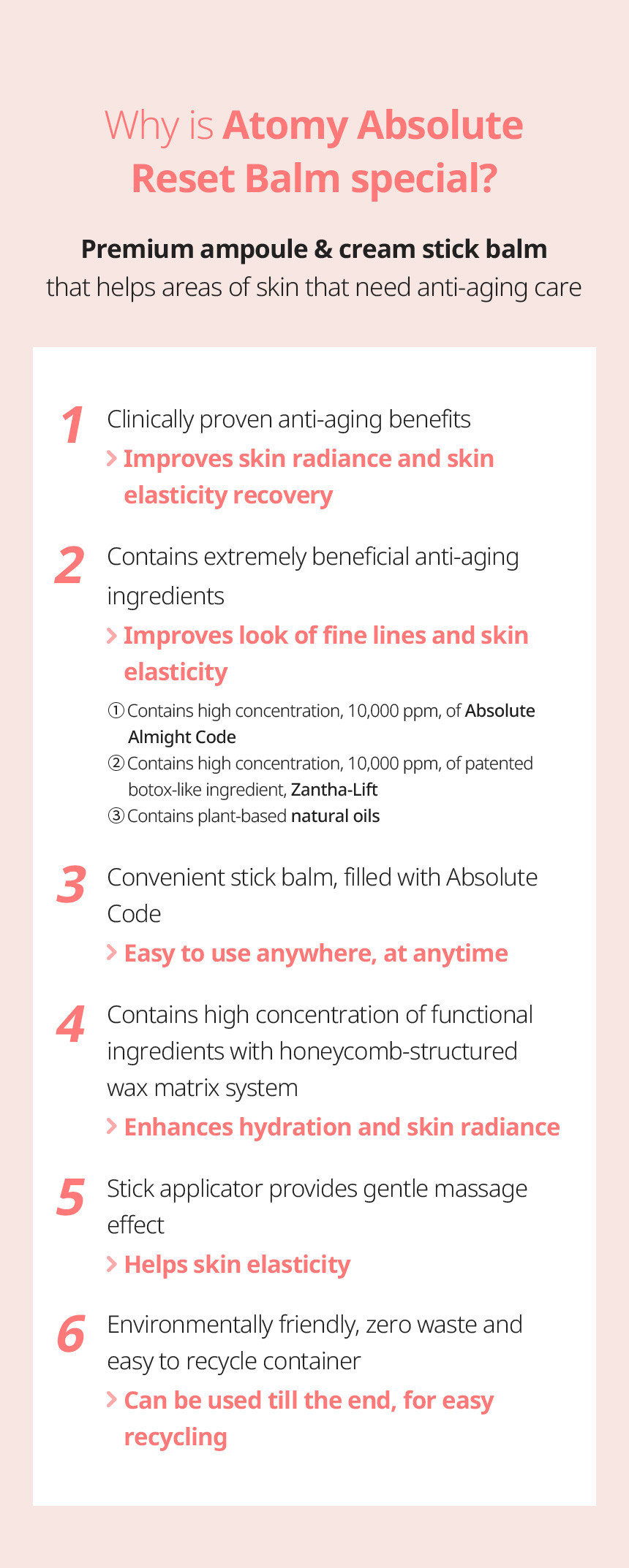 অ্যাটমির অ্যাবসোলিউট রিসেট বাম *৪ একটি প্রিমিয়াম ত্বকের যত্নের সেট যা ত্বককে পুনর্জীবিত এবং পুনরুদ্ধার করার জন্য ডিজাইন করা হয়েছে। এই সংগ্রহে সম্ভবত চারটি বাম অন্তর্ভুক্ত, প্রতিটি পুষ্টিকর উপাদান দ্বারা সমৃদ্ধ, যা ত্বককে হাইড্রেট, শান্ত এবং মেরামত করে। প্রতিটি বামের ফর্মুলা সম্ভবত নরম তবে কার্যকর, সব ধরনের ত্বকের জন্য উপযুক্ত। বামগুলির সমৃদ্ধ এবং আরামদায়ক গঠন একটি শান্ত প্রয়োগ অভিজ্ঞতা প্রদান করে। একটি সম্পূর্ণ ত্বকের যত্নের রুটিনের জন্য আদর্শ, এই বামগুলি একসাথে কাজ করে ত্বককে পুনরায় সেট করে, একটি তরতাজা এবং পুনরুজ্জীবিত চেহারা প্রচার করে।