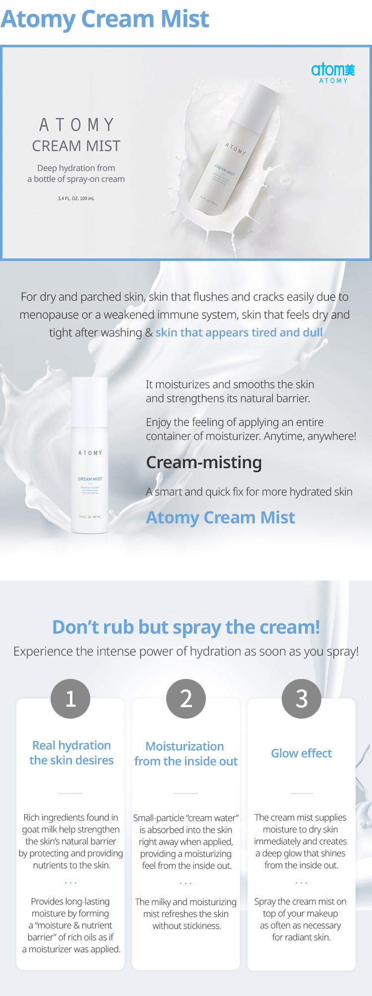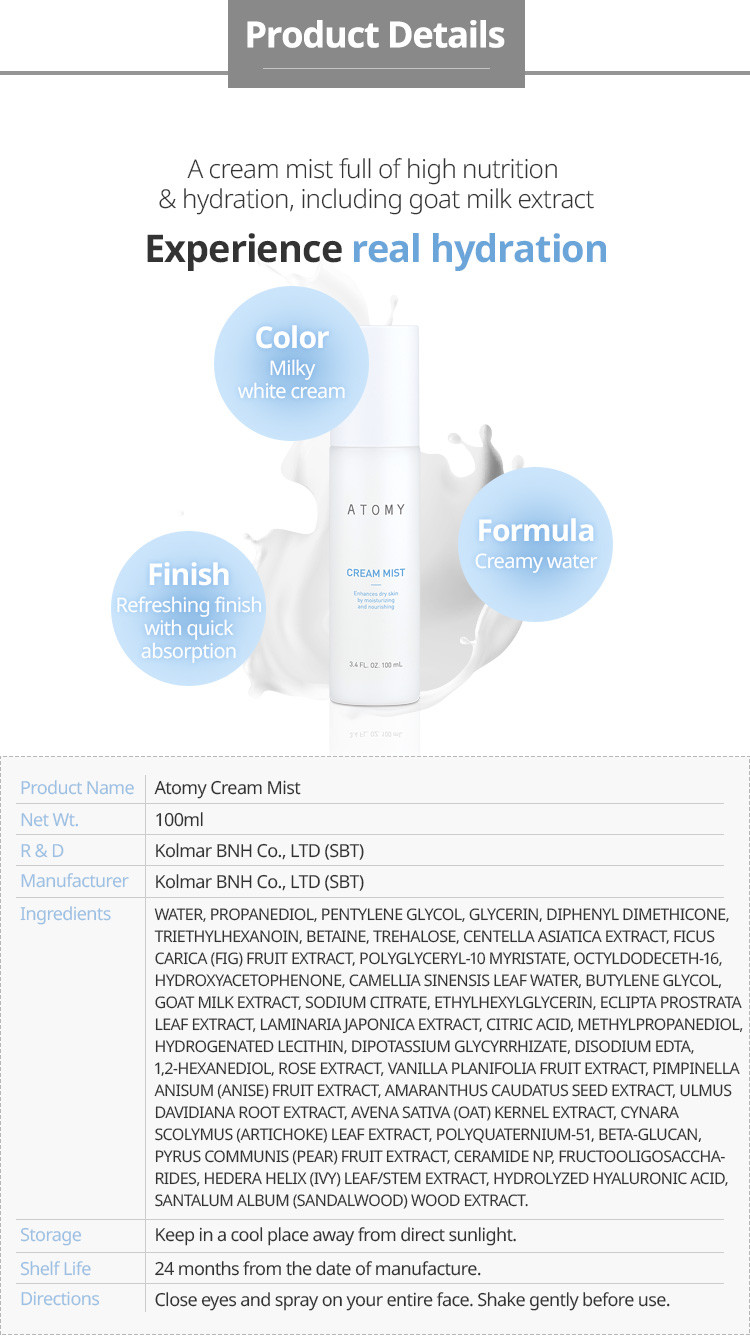 অ্যাটমির ক্রিম মিস্ট একটি অনন্য এবং উদ্ভাবনী ত্বকের যত্নের পণ্য যা ক্রিমের পুষ্টিকর গুণাবলী এবং মিস্টের প্রশান্তিদায়ক অভিজ্ঞতাকে একত্রিত করে। এই পণ্যটি ত্বকে তাৎক্ষণিক আর্দ্রতা এবং শান্তির অনুভূতি প্রদানের জন্য ডিজাইন করা হয়েছে। এটি দিনের যেকোনো সময়ে ব্যবহারের জন্য উপযুক্ত, বিশেষ করে যখন আপনার ত্বক শুষ্ক মনে হয় বা দ্রুত প্রশান্তির প্রয়োজন হয়। ক্রিম মিস্ট উচ্চমানের উপাদান দ্বারা তৈরি যা ত্বকের জন্য নরম, এবং এটি সকল ধরনের ত্বকের জন্য উপযুক্ত। এর হালকা এবং নন-গ্রিসি ফর্মুলা নিশ্চিত করে যে এটি দ্রুত শোষিত হয়, ত্বককে নরম, আর্দ্র এবং পুনর্জীবিত অনুভূতি দেয়।